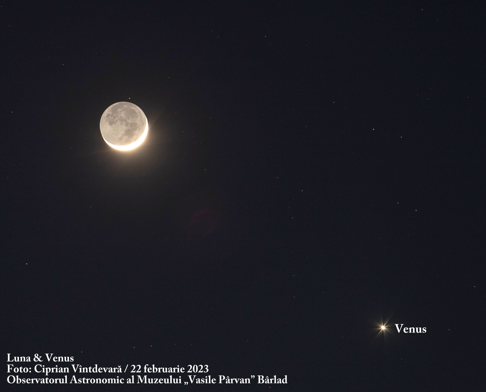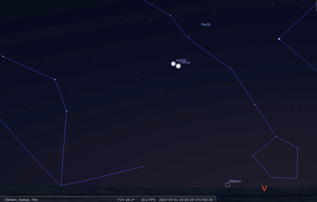 Începutul lunii martie debutează cu un fenomen astronomic spectaculos: conjuncţia strânsă dintre planetele Venus şi Jupiter. În serile de 1 şi 2 martie 2023 cele două planete se vor vedea foarte aproape unde de alta, spre orizontul vestic, la aproximativ jumătate de oră după apusul Soarelui. Apropierea este una aparentă, nu fizică, rezultat al mişcărilor pe orbită a celor două planete, dar şi poziţia favorabilă a Pământului în spaţiu din această perioadă!