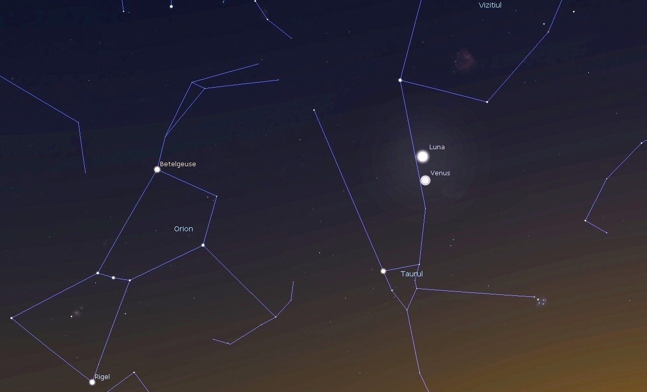 Pe 23 aprilie va şi Luna în apropiere de planeta Venus, unde o să admirăm din nou o frumoasă conjuncţie dintre cele două corpuri cereşti.