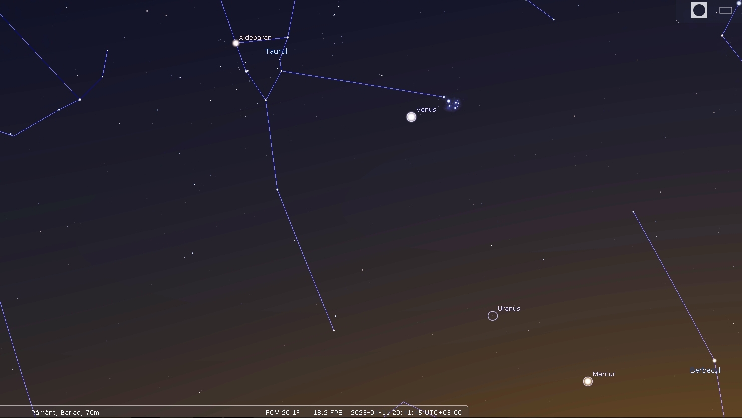 Planeta Venus în conjuncţie cu roiul deschis de stele Pleiadele. Mai jos se poate observa şi planeta Mercur ce revine pe cerul de seară. Animaţia a fost realizată pentru ziua de 11 aprilie 2023, ora 20:40, cu ajutorul aplicaţiei Stellarium.