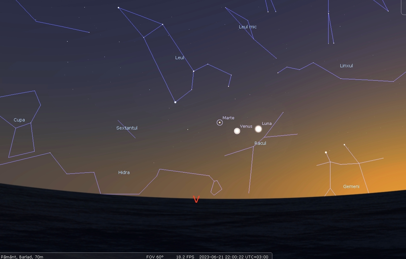 Luna, planetele Venus şi Marte vor fi în conjunctie în seara de 21 iunie 2023, ora 22:00. Animaţia a fost realizată cu ajutorul aplicaţiei Stellarium