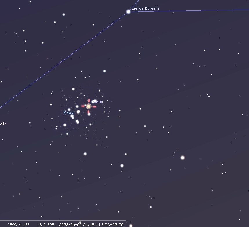 Planeta Marte tranzitează roiul de stele Messier 44 (Beehive Cluster), în seara zilei de 2 iunie 2023, ora 22:00. Animaţia a fost realizată cu ajutorul aplicaţiei Stellarium.