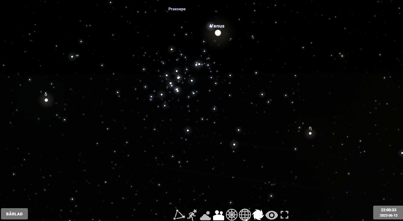 Planeta Venus va fi în conjuncţie cu roiul de stele Messier 44 în seara de 13 iunie 2023, ora 22:00. Animaţia a fost realizată cu ajutorul aplicaţiei Stellarium