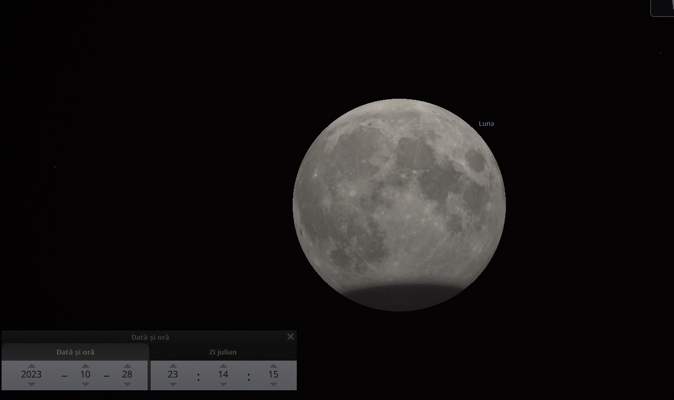 Eclipsa se va observa în întregime din ţara noastră în seara zilei de 28 octombrie 2023. Maximul va avea loc la ora 23:14 (Ora României). Magnitudinea maximă va fie de 0.12 (12%).