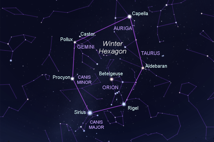 De la latitudinile noastre, Sirius este cea mai apropiată stea care se vede cu ochiul liber. Face parte din constelația Canis Major (Câinele Mare). Privit pe hartă și pe cer, Canis Major pare un cățel care stă pe labele din spate și poartă la zgardă steaua Sirius. La stânga sus de Sirius se află o altă stea strălucitoare: Procyon, din constelația Canis Minor (Câinele Mic). Aceste două constelații reprezintă pe cei doi câini de vânătoare ai lui Orion. Comparați steaua Betelgeuse (umărul stâng al lui Orion) cu Sirius și Procyon, și veți vedea că au culori diferite. Betelgeuse este portocalie, Procyon alb-gălbuie, iar Sirius albăstruie. Spre nord-est întâlnim constelația Ursa Major (Ursa Mare), care revine pe cerul de seară. Ceea ce vedem ușor pe cer este de fapt o parte din constelație, șapte stele care poartă numele de „Carul Mare”, care în această perioadă stă cu oiștea în jos. Spre est răsare Leo (Leul) împreună cu steaua Regulus, o constelaţie a cerului de primăvară. Tot în zonă se găseşte şi constelaţia Hydra. Cea mai strălucitoare stea se numește Alphard. În limba arabă numele stelei înseamnă „cea singuratică”. Sursa: Observatorul Astronomic „Amiral Vasile Urseanu”.