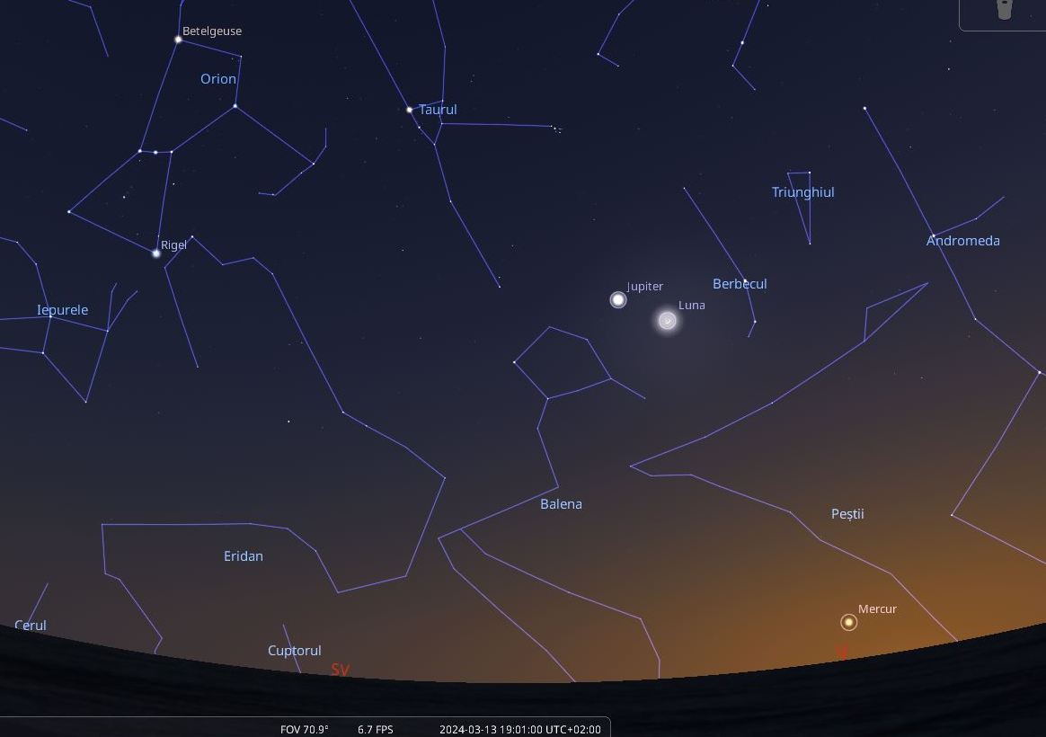 Pe 13 martie Luna va ajunge mai sus pe cer, în dreptul lui Jupiter. În seara zilei respective o să puteţi observa o frumoasă conjuncţie dintre cea mai mare planetă din Sistemul Solar şi satelitul natural al Pământului. Dacă urmăriţi Luna în fiecare seară o să observaţi cum aceasta creşte în fază şi devine mai strălucitoare, iar în acelaşi timp se va deplasa spre est cam cu 12 grade pe zi.