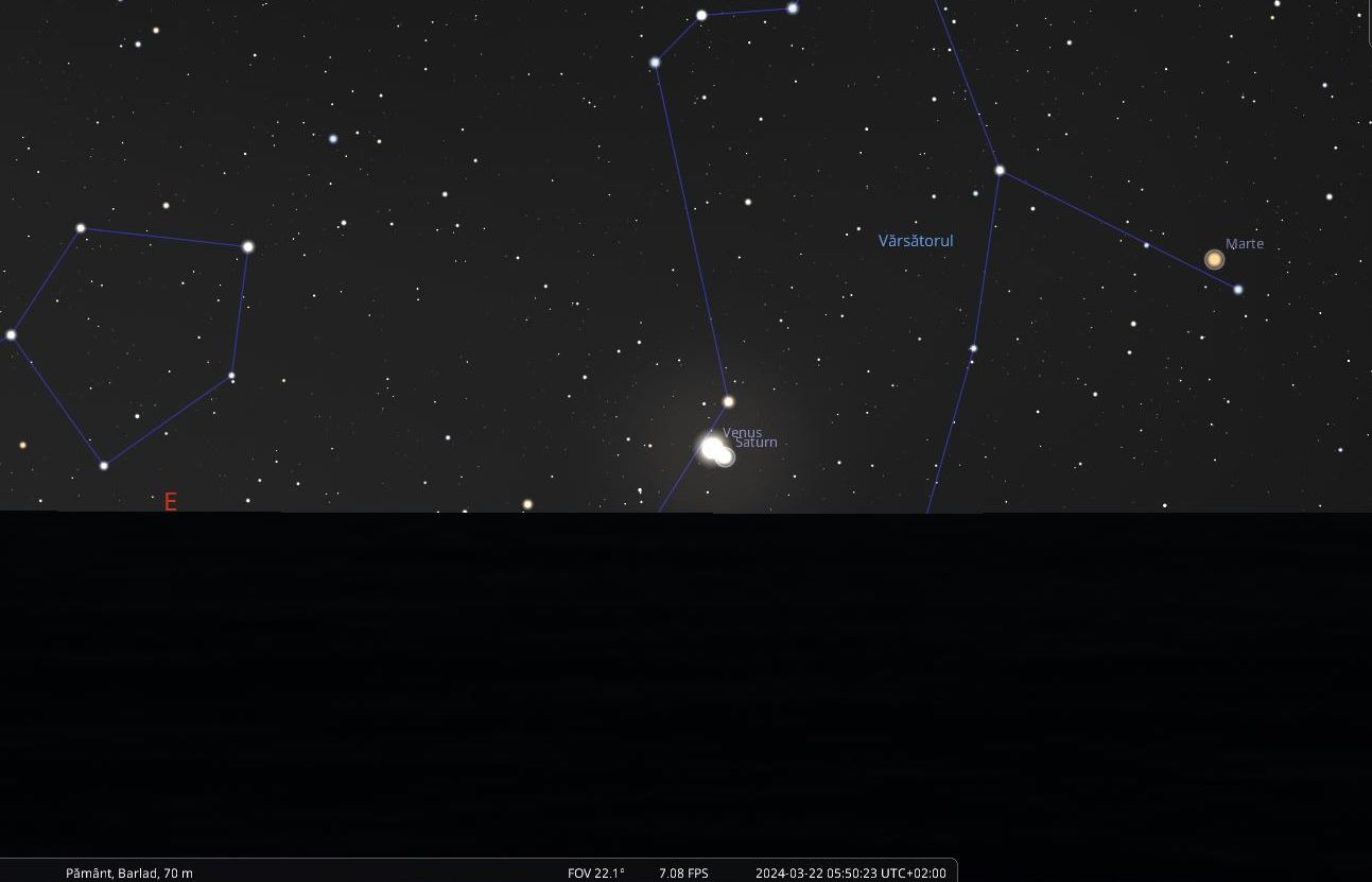 În dimineaţa zilei de 22 martie va avea loc un eveniment astronomic destul de spectaculos, planetele Venus şi Saturn vor fi într-o conjuncţie apropiată de numai 0.2 grade. Efectiv cele două planete se vor putea observa în acelaşi timp prin telescop! Fenomenul în sine va fi foarte greu de observat. Va trebui să mergeţi în afara oraşului, într-un loc înalt, cu orizontul estic cât mai jos şi cât mai liber posibil. Cu ajutorul unui binoclu puteţi să localizaţi cele două planete în lumina destul generoasă a crepusculului de dimineaţă.
