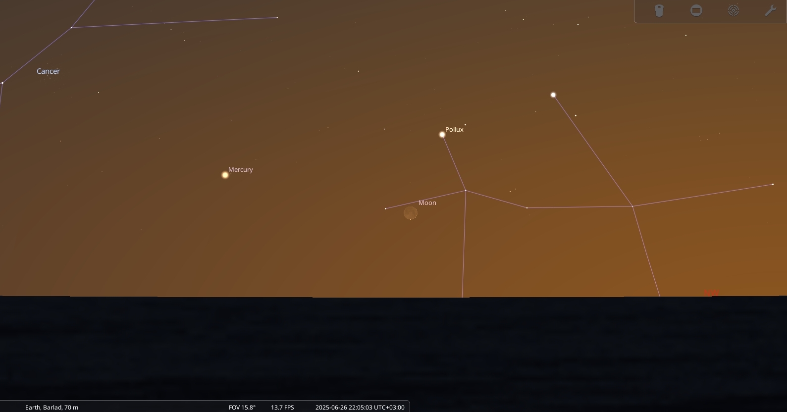 În luna iunie, pe cerul de seară, spre orizontul nord-vestic, va fi vizibilă planeta Mercur. Pe 26 iunie, în jurul orei 22:00, Luna va fi în apropiere, cel mai probabil vizibilă ca o seceră foarte subțire. Este un fenomen astronomic interesant, care merită observat și chiar fotografiat!