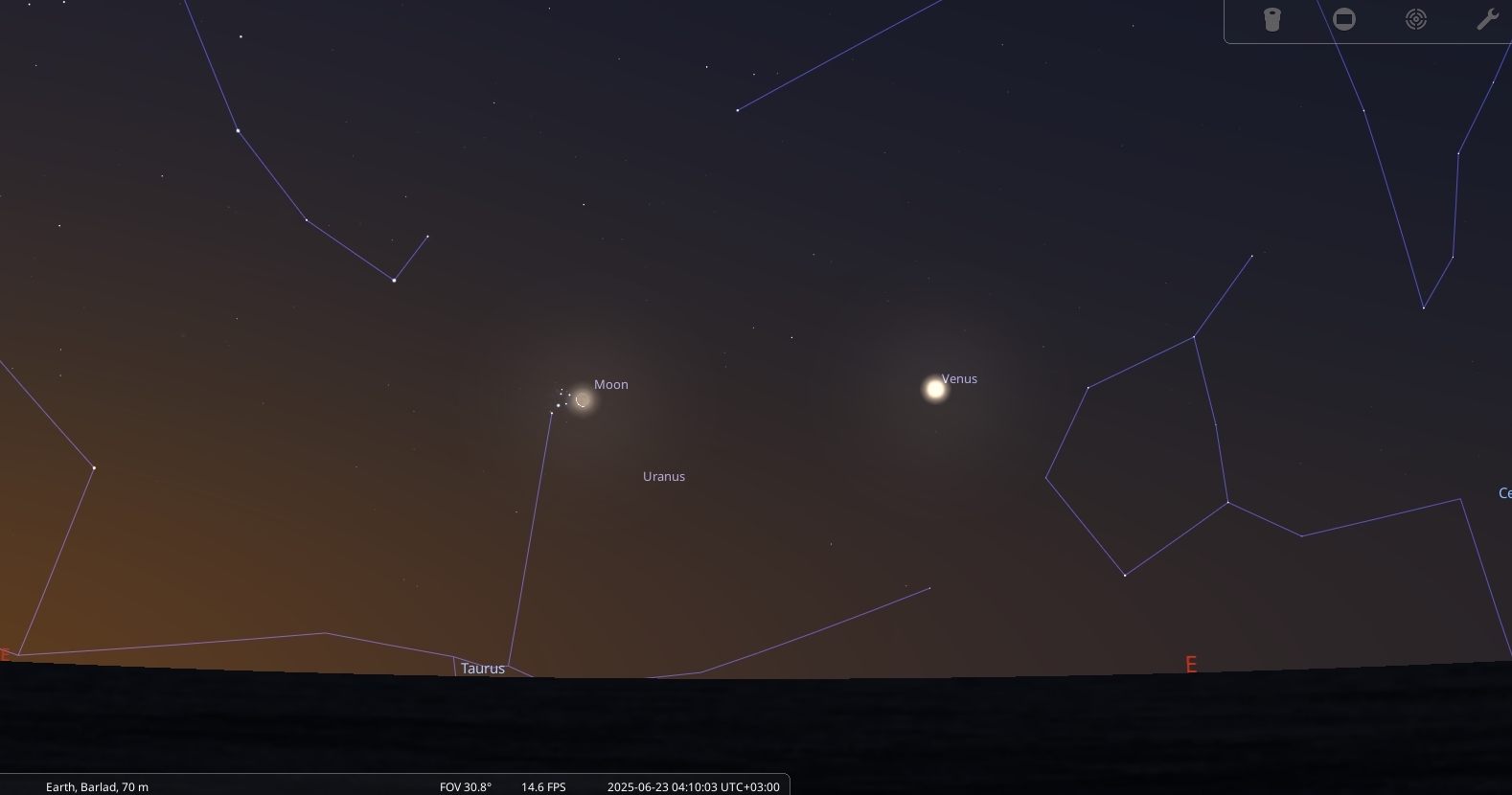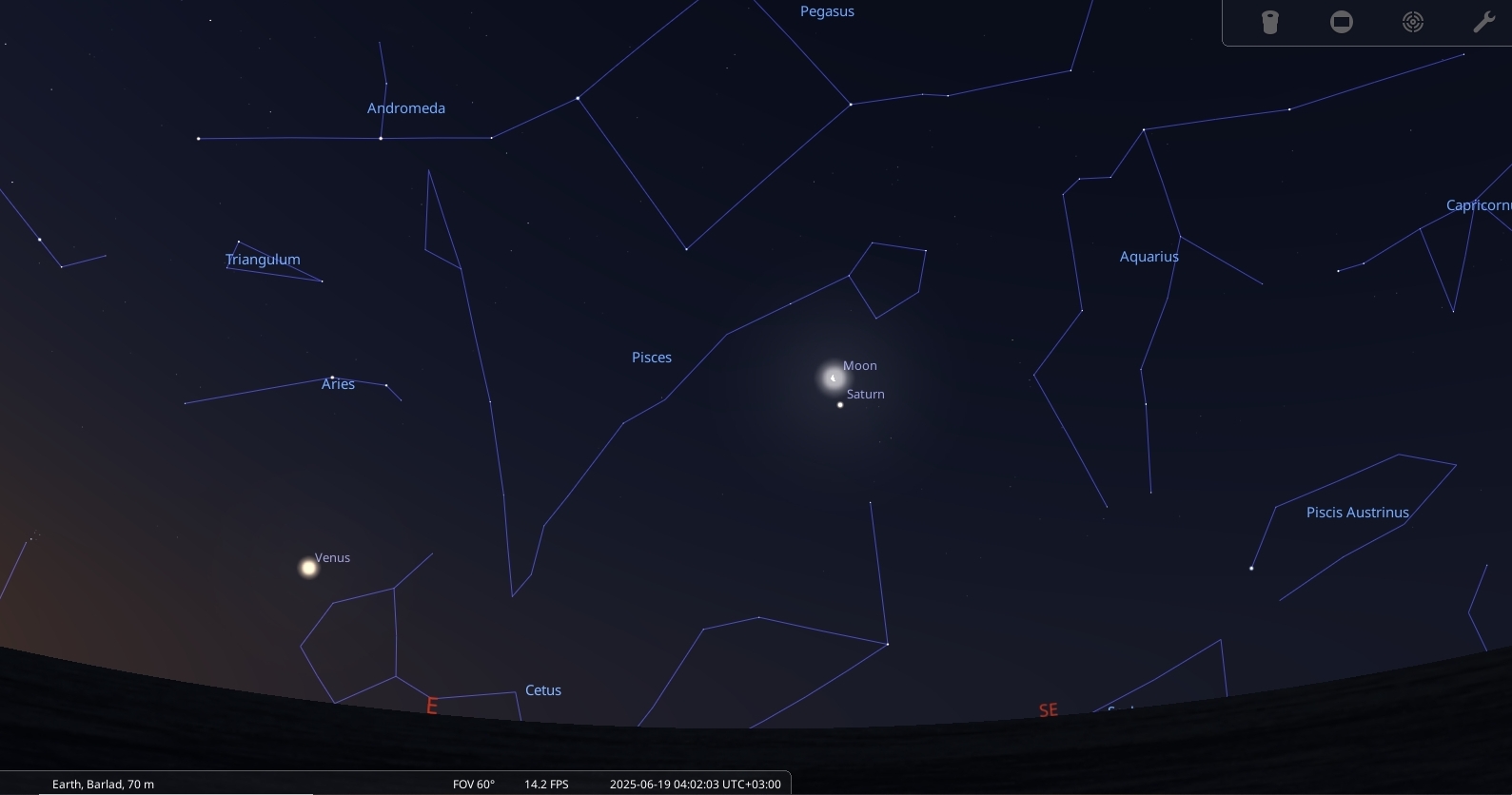 Pe 19 iunie 2025, Luna va fi în conjuncție cu planeta Saturn. Jos, aproape de orizontul estic, se poate observa planeta Venus, un astru foarte strălucitor, cunoscut și sub numele popular de „Luceafărul”.