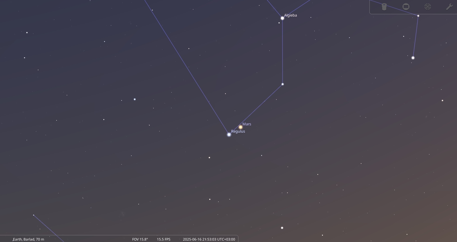 Pe 16 iunie 2025, planeta Marte va fi în conjuncție cu steaua Regulus. Fenomenul va fi vizibil seara, după ora 22:00.