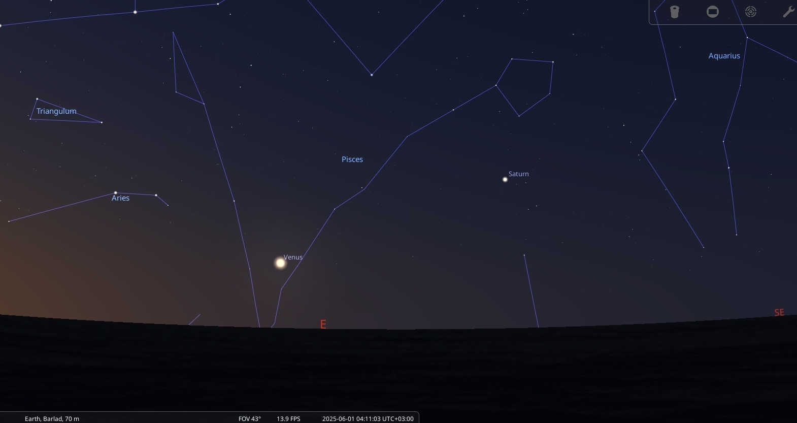 Pe 1 iunie 2025, planeta Venus va fi la elongație vestică maximă. Se va putea observa dimineața, spre orizontul estic, înainte de răsăritul Soarelui. Puțin mai sus spre sud-est va fi vizibilă și planeta Saturn.