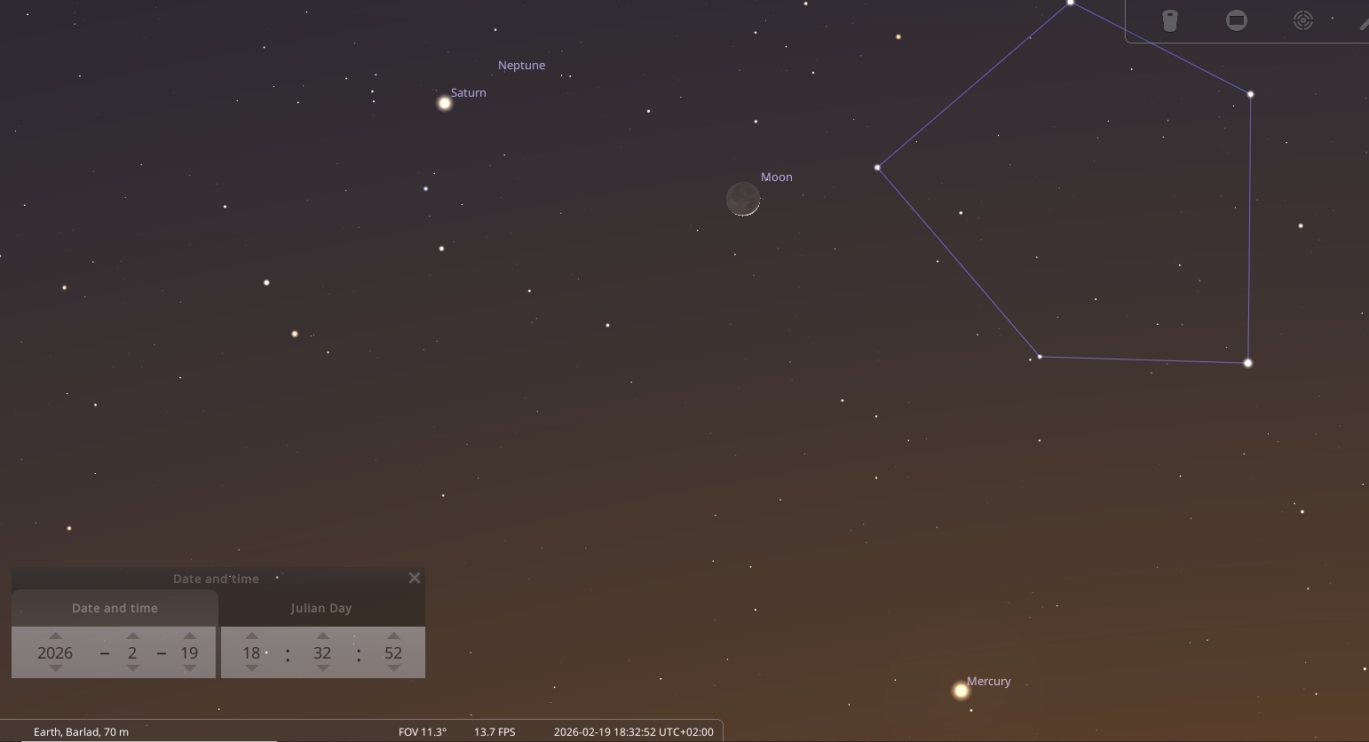 Planeta Saturn se va mai putea observa seara, spre orizontul sud-vestic. Luna va fi în apropiere în seara zilei de 19 februarie 2026. Lângă Saturn se află și planeta Neptun, aceasta nefiind vizibilă decât printr-un telescop destul de performant.