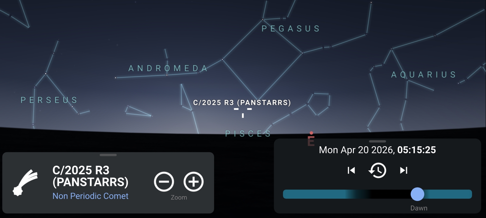 O a doua cometă care se anunță interesantă este C/2025 R3 (PANSTARRS), descoperită în anul 2025 de survey-ul PANSTARRS. Aceasta va fi vizibilă începând cu dimineața zilei de 19 aprilie 2026, undeva în zona constelației Pegas, spre orizontul estic.