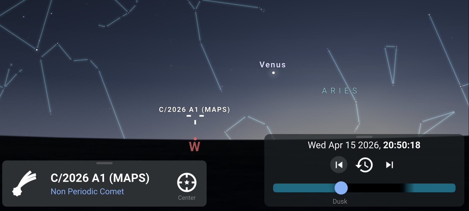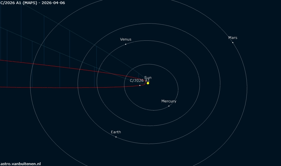 Cometa care va vizita cerul pământenilor în luna aprilie se numește C/2026 A1 (MAPS), descoperită în luna ianuarie a acestui an de către survey-ul AMACS1 Observatory din deșertul Atacama. Va ajunge la periheliu pe 4 aprilie 2026, adică la distanța minimă față de Soare (162.000 km față de suprafața Soarelui), iar pe 6 aprilie 2026 va fi la distanța minimă față de Pământ, de aproximativ 144 de milioane de km. Faptul că va trece foarte aproape de Soare înseamnă că există șansa ca cometa să fie distrusă, așa cum au fost și alte comete în trecut, sau, dimpotrivă, poate deveni foarte strălucitoare dacă trece cu bine de periheliu. Din acest motiv, astronomii sunt rezervați în estimarea evoluției cometelor. Dacă va crește suficient de mult în strălucire, cometa va fi oarecum vizibilă printr-un binoclu sau chiar cu ochiul liber. Totuși, trebuie să luăm în calcul că aceasta va fi poziționată foarte jos, aproape de orizontul vestic, în lumina crepusculului de seară. Momentul potrivit pentru observare va fi, cel mai probabil, începând cu 11 aprilie, în intervalul orar 20:50–21:00.