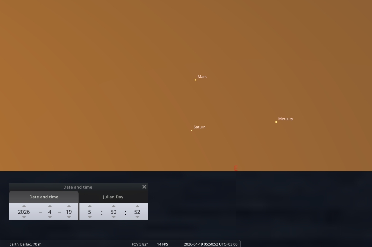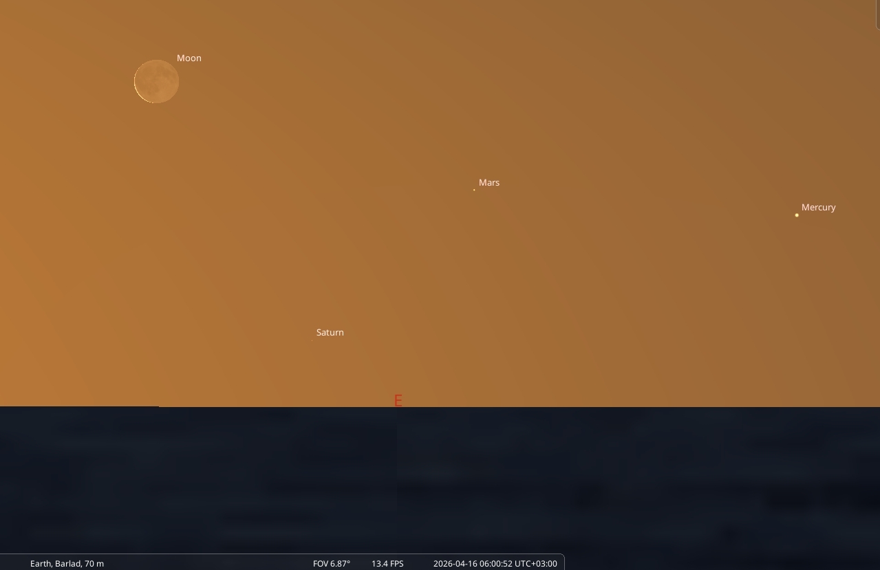 Secera subțire a Lunii, la ora 6:00 dimineața, pe 16 aprilie 2026, și, în apropiere, trei planete care vor fi greu de observat: Marte, Mercur și Saturn. Dacă vreți să le observați, trebuie să fiți într-un loc înalt, cu orizontul estic și sud-estic cât mai jos. Recomand folosirea unui binoclu.