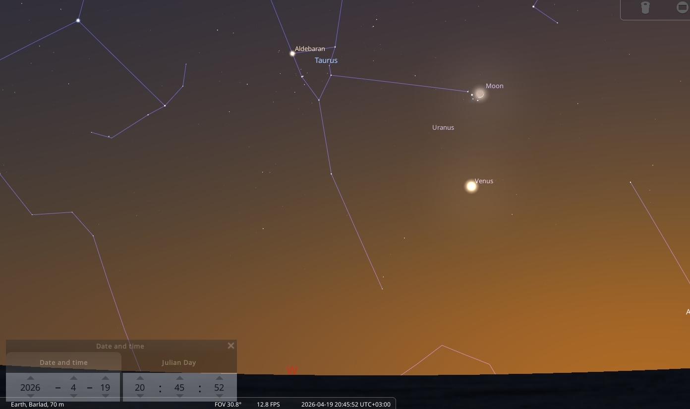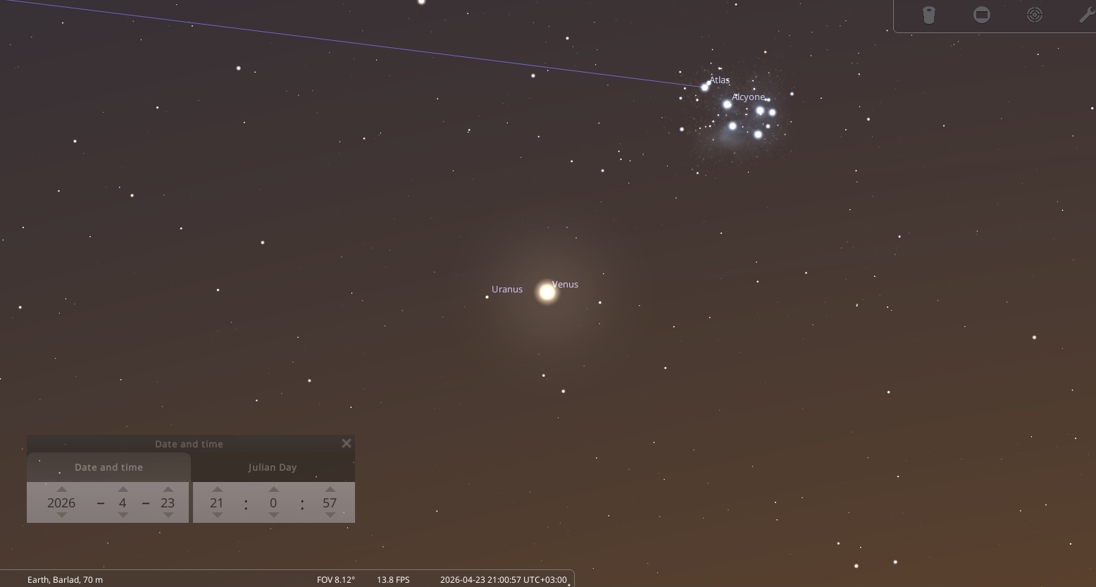 O ocazie interesantă pentru observații astronomice va fi în seara zilei de 23 aprilie, la ora 21:00, când planetele Venus și Uranus vor fi în conjuncție, nu departe de roiul deschis de stele Pleiadele.