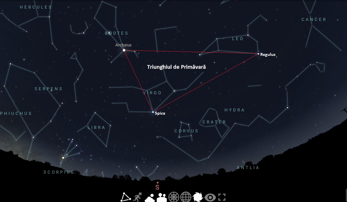 Pe cerul lunii aprilie se pot observa seara, imediat după lăsarea întunericului, constelațiile cerului de primăvară. Cele mai cunoscute dintre acestea sunt: Leul, Fecioara, Hidra, Boarul etc. În constelația Boarul găsim o stea strălucitoare care se numește Arcturus și se află la o distanță de 36 de ani-lumină de noi. Dacă prelungim o linie imaginară de la steaua Arcturus spre sud-est, găsim o altă stea strălucitoare: Spica, din constelația Fecioara. Astronomii se folosesc de stelele mai strălucitoare pentru a trasa configurații pe cer, repere de orientare și pentru popularizarea astronomiei. În acest sens, dacă unim cu linii imaginare cele mai strălucitoare stele de pe cerul de primăvară — Regulus din constelația Leul, Arcturus din Boarul și Spica din Fecioara — se formează un triunghi uriaș pe cer, numit „Triunghiul de Primăvară”, așa cum este reprezentat în imaginea de mai sus. Dintre cele patru anotimpuri, doar cel de toamnă nu are un astfel de triunghi, deoarece nu găsim acolo atât de multe stele strălucitoare. Chiar dacă am intrat oficial în anotimpul de primăvară, încă mai putem observa seara, spre sud și sud-vest, stele, constelații și configurații care aparțin cerului de iarnă, în mod special „Triunghiul de iarnă”, format din stelele Betelgeuse din Orion, Procyon din Câinele Mic și Sirius din Câinele Mare.